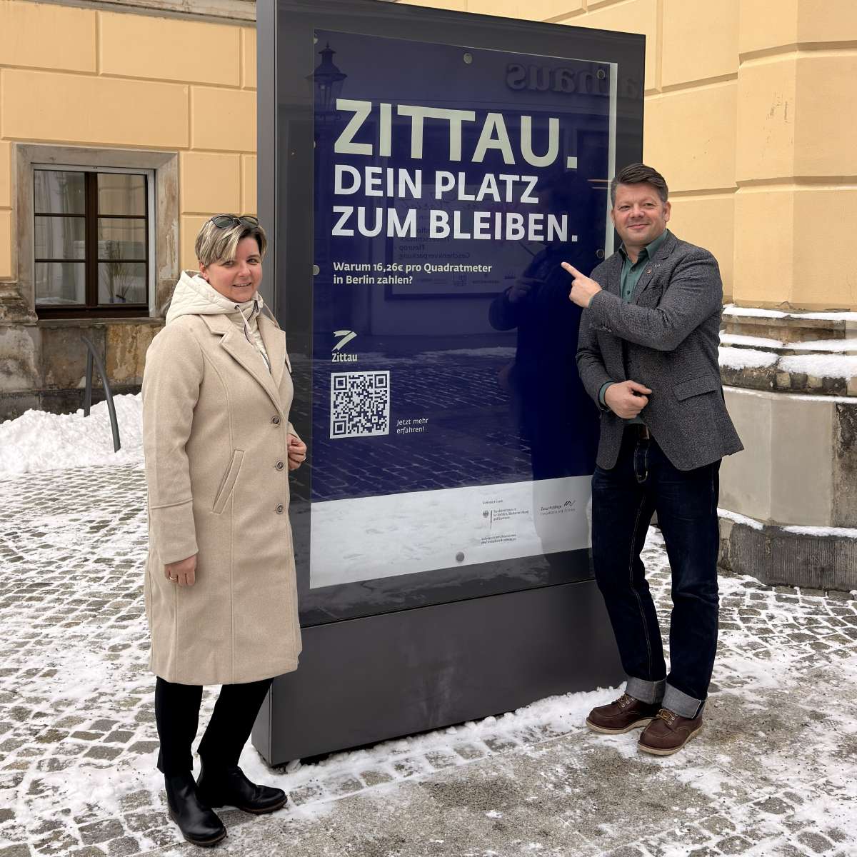 Oberbürgermeister Thomas Zenker und Susanne Mannschott, Geschäftsführerin der Zittauer Stadtentwicklungsgesellschaft am Citylight-Display am Zittauer Rathausplatz.